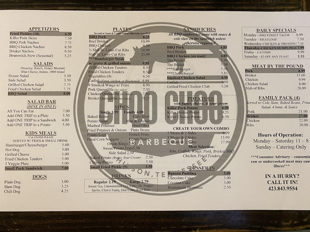 Welcome to Choo Choo BBQ of Hixson, where great southern BBQ meets warm hospitality! Located at 6410 Hixson Pike, we specialize in mouthwatering grilled dishes and home-cooked meals that embody the flavors of the South. Whether you dine in, take out, or opt for our convenient delivery service, our inviting atmosphere is perfect for solo diners, families, and groups alike. Enjoy a wide selection of teas and local specialties, with options for everyone, including kids. With accessible seating and restroom facilities, we ensure a comfortable experience for all. Come savor the tradition of southern cooking today!